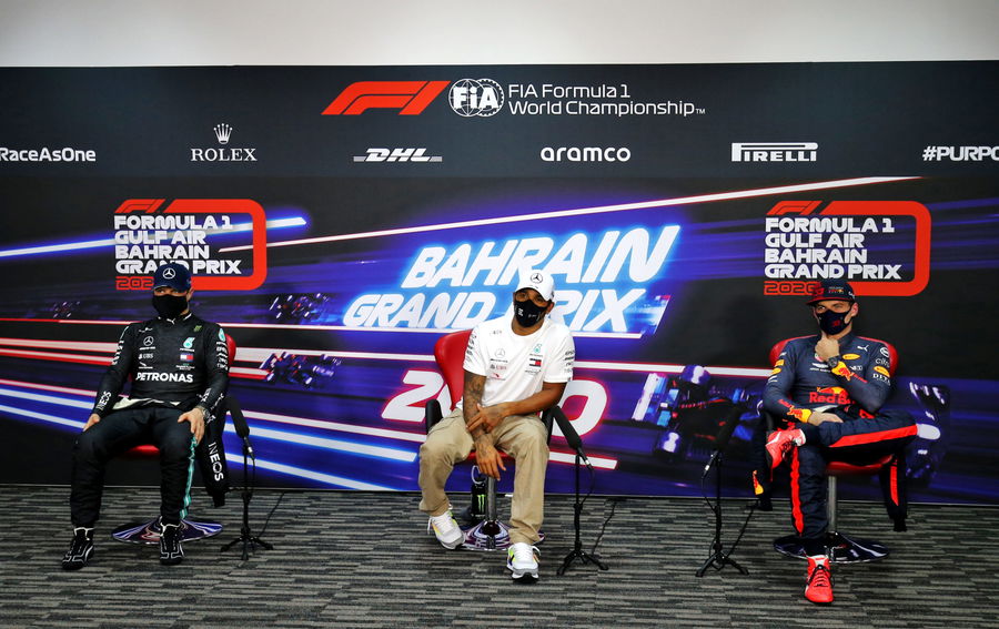 Formula One F1 – Bahrain Grand Prix – Bahrain International Circuit, Sakhir, Bahrain – November 28, 2020 Mercedes’ Valtteri Bottas, Mercedes’ Lewis Hamilton and Red Bull’s Max Verstappen during the post qualifying FIA Press Conference FIA/Handout via REUTERS