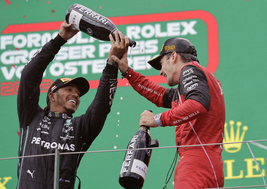 Formula One F1 – Austrian Grand Prix – Red Bull Ring, Spielberg, Austria – July 10, 2022 Ferrari’s Charles Leclerc celebrates on the podium after winning the Austrian Grand Prix as Mercedes’ Lewis Hamilton celebrates after placing third REUTERS/Leonhard Foeger