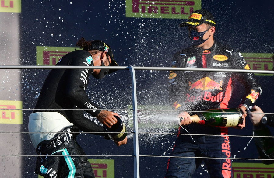 Formula One F1 – Tuscan Grand Prix – Mugello, Scarperia e San Piero, Italy – Mercedes’ Lewis Hamilton sprays sparkling wine on the podium as celebrates after winning the race with third placed Red Bull’s Alexander Albon |REUTERS