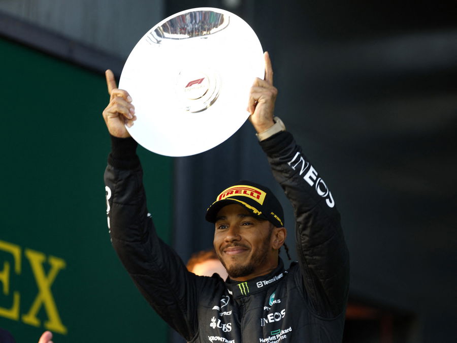 Formula One F1 – Australian Grand Prix – Melbourne Grand Prix Circuit, Melbourne, Australia – April 2, 2023 Mercedes’ Lewis Hamilton celebrates his second placed finish on the podium REUTERS/Darrian Traynor