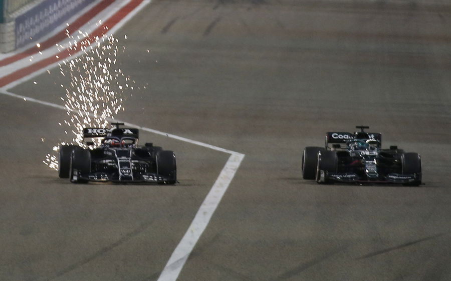 Formula One F1 – Bahrain Grand Prix – Bahrain International Circuit, Sakhir, Bahrain – March 28, 2021 Aston Martin’s Lance Stroll and AlphaTauri’s Yuki Tsunoda in action during the race REUTERS/Hamad I Mohammed