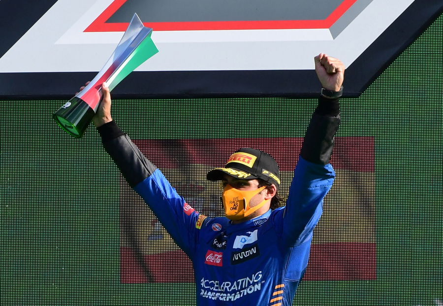 Formula One F1 – Italian Grand Prix – Autodromo Nazionale Monza, Monza, Italy – September 6, 2020 Second placed McLaren’s Carlos Sainz Jr. celebrates on the podium REUTERS/Jennifer Lorenzini/Pool