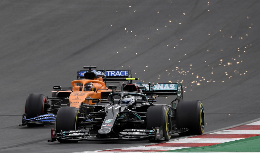 Formula One F1 – Portuguese Grand Prix – Algarve International Circuit, Portimao, Portugal – October 25, 2020 Mercedes’ Valtteri Bottas and McLaren’s Carlos Sainz Jr. in action during the race Pool via REUTERS/Jorge Guerrero