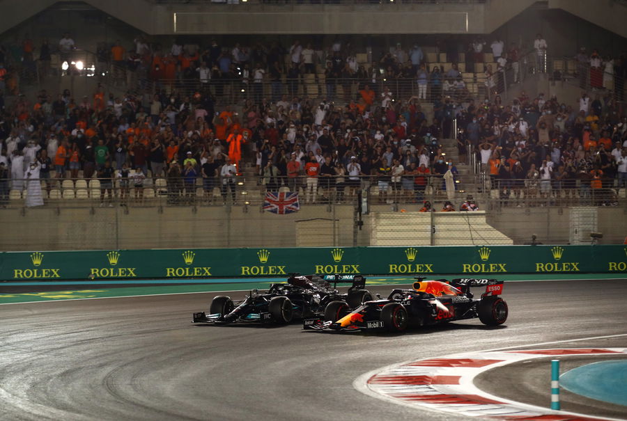 ABU DHABI, UNITED ARAB EMIRATES – DECEMBER 12: Max Verstappen of the Netherlands driving the (33) Red Bull Racing RB16B Honda and Lewis Hamilton of Great Britain driving the (44) Mercedes AMG Petronas F1 Team Mercedes W12 compete for position on track during the F1 Grand Prix of Abu Dhabi at Yas Marina Circuit on December 12, 2021 in Abu Dhabi, United Arab Emirates. (Photo by Joe Portlock – Formula 1/Formula 1 via Getty Images)