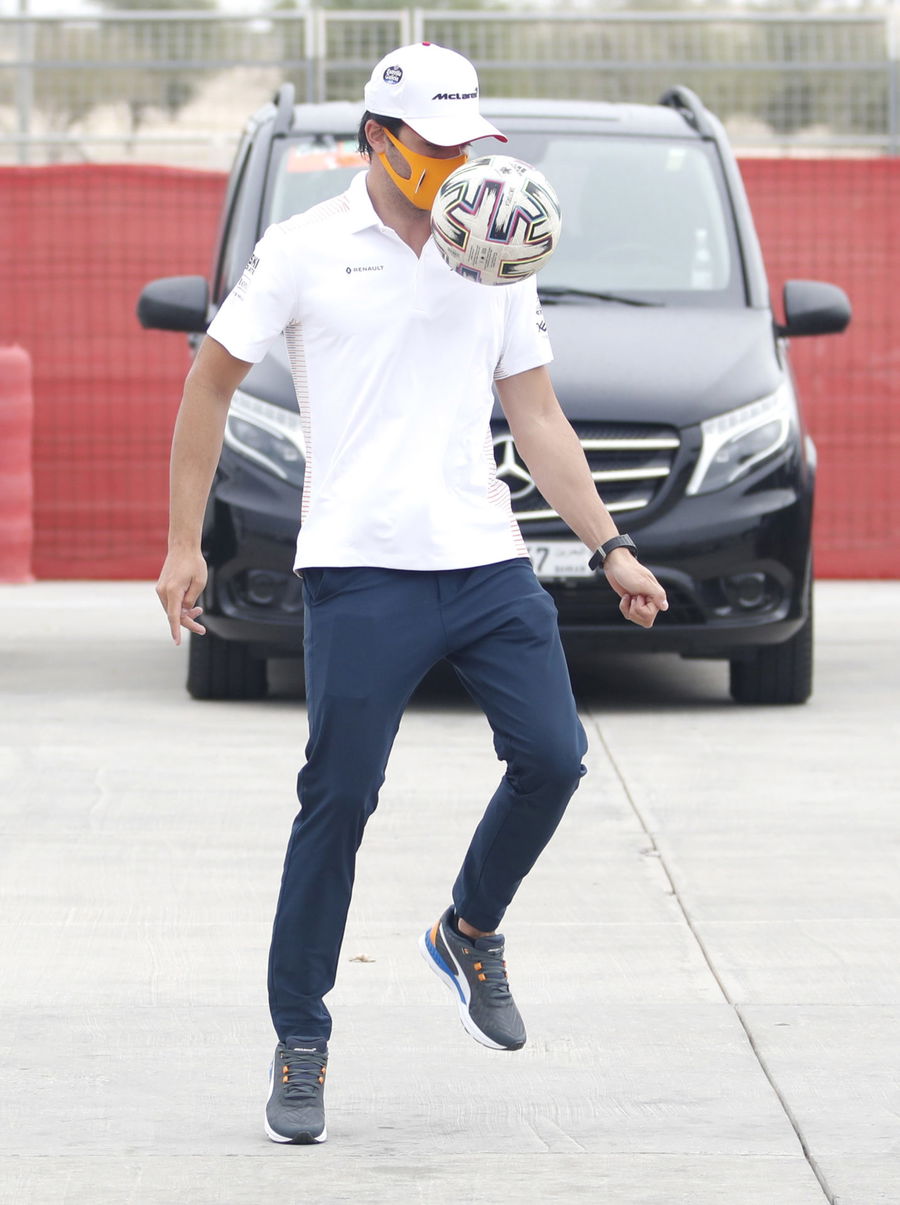Formula One F1 – Bahrain Grand Prix – Bahrain International Circuit, Sakhir, Bahrain – November 27, 2020 McLaren’s Carlos Sainz Jr. playing football in the paddock Pool via REUTERS/Hamad I Mohammed