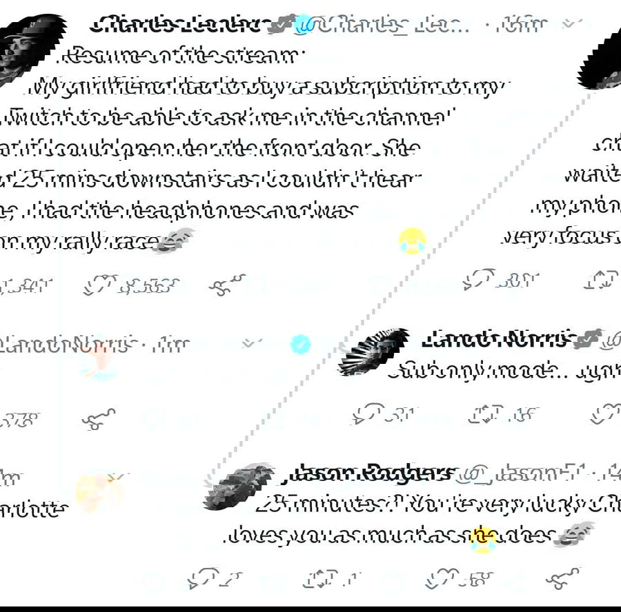 . @Charles_Leclerc : "So my girlfriend had to subscribe to my twitch channel to tell me to open the door." 🤣