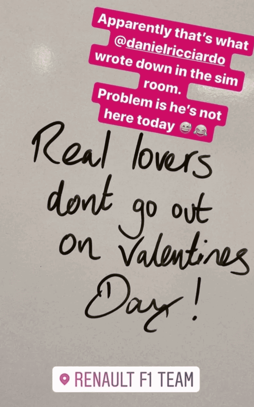 Speaking of Ricciardo and Valentine’s Day, the Australian driver wrote a small message in the simulator room. The little ‘love note’ read, “Real lovers don’t go out on Valentine’s Day”. When the message was later discovered, it transpired that the 30-year old took his own advice.