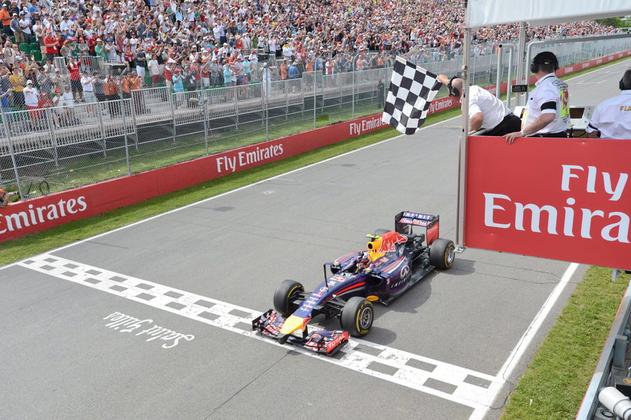 Red Bull Racing driver Daniel Ricciardo of Australia takes the checkered flag to win the Canadian Grand Prix, Sunday, June 8, 2014 in Montreal. (AP Photo/The Canadian Press, Paul Chiasson) ORG XMIT: PCH503