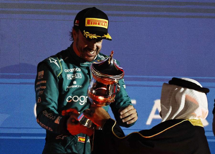ALONSO Fernando spa, Aston Martin F1 Team AMR23, portrait celebrates his podium with the trophy at the podium during the Formula 1 Gulf Air Bahrain Grand Prix 2023, 1st round of the 2023 FIA Formula One World Championship, WM, Weltmeisterschaft from March 2 to 5, 2023 on the Bahrain International Circuit, in Sakhir, Bahrain – F1 – BAHRAIN GRAND PRIX 2023 – RACE DPPI/Panoramic PUBLICATIONxNOTxINxFRAxITAxBEL 00123003__R3_2252