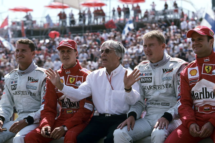 David Coulthard, Michael Schumacher, Bernie Ecclestone, Mikka Hakkinen, Rubens Barrichello, Grand Prix of Hungary, Hungaroring, 13 August 2000. Champions united around Bernie Ecclestone at the Hungaroring in 2000: David Coulthard, Michael Schumacher, Bernie Ecclestone, Mikka Hakkinen and Rubens Barrichello. (Photo by Paul-Henri Cahier/Getty Images)