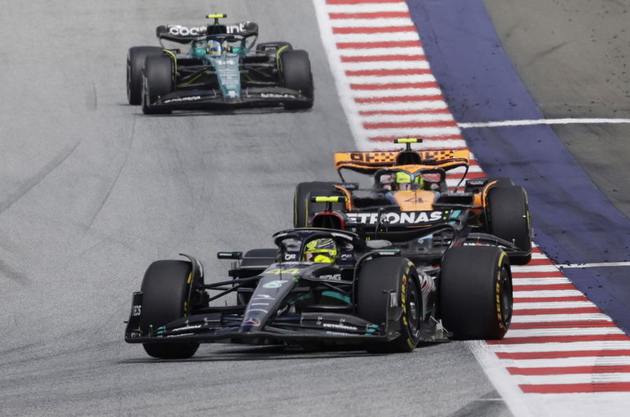 Formula One F1 – Austrian Grand Prix – Red Bull Ring, Spielberg, Austria – July 2, 2023 Mercedes’ Lewis Hamilton, McLaren’s Lando Norris and Aston Martin’s Fernando Alonso in action during the race REUTERS/Leonhard Foeger