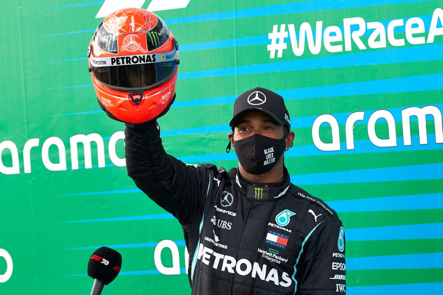 Formula One F1 – Eifel Grand Prix – Nurburgring, Nurburg, Germany – October 11, 2020 Mercedes’ Lewis Hamilton poses with a red helmet from Mick Schumacher after winning the race FIA/Handout via REUTERS