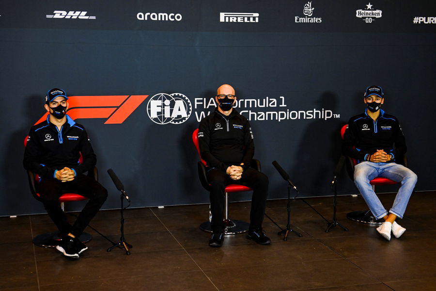 Formula One F1 – Emilia Romagna Grand Prix – Autodromo Internazionale Enzo e Dino Ferrari, Imola, Italy – Williams’ Nicholas Latifi, Williams’ Acting Team Principal Simon Roberts and Williams’ George Russell during a press conference FIA/Handout via REUTERS
