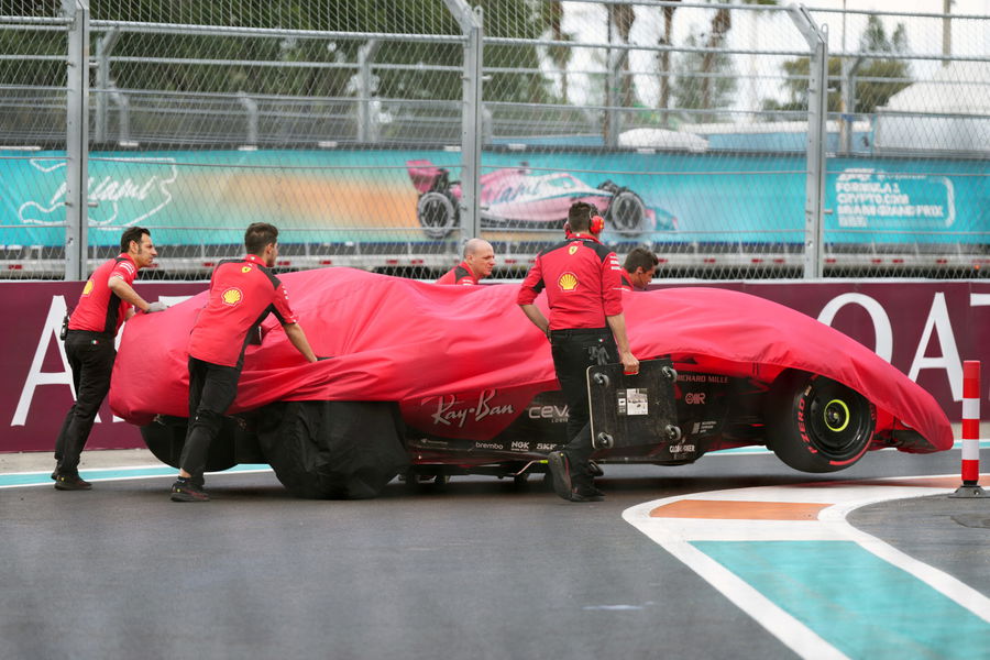 May 6, 2023; Miami Gardens, Florida, USA; Crew members push the wrecked car of Ferrari driver Charles Leclerc (16) of Monaco back to the garage after qualifying for the Miami Grand Prix at Miami International Autodrome. Mandatory Credit: Jasen Vinlove-USA TODAY Sports
