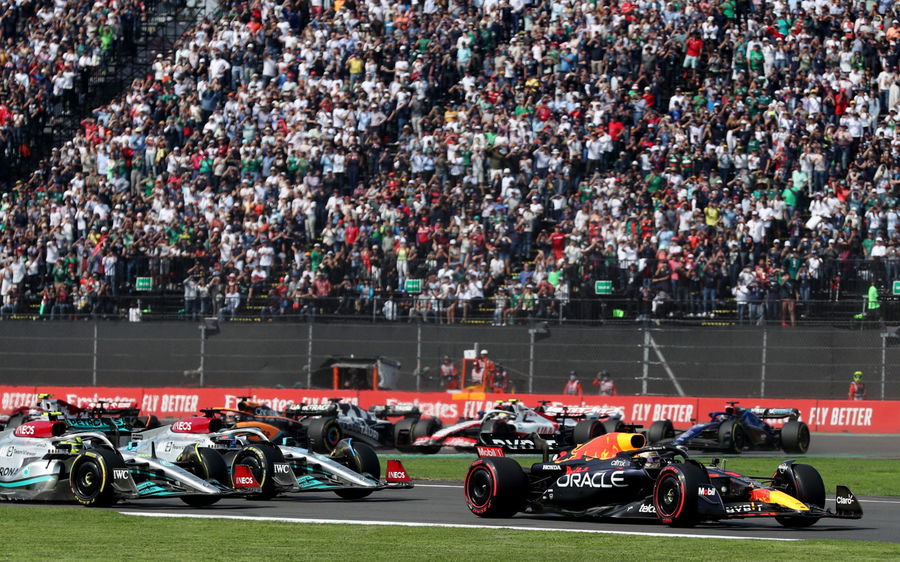 Formula One F1 – Mexico City Grand Prix – Autodromo Hermanos Rodriguez, Mexico City, Mexico – October 30, 2022 Red Bull’s Max Verstappen in action ahead of Mercedes’ George Russell and Mercedes’ Lewis Hamilton during the race REUTERS/Edgard Garrido