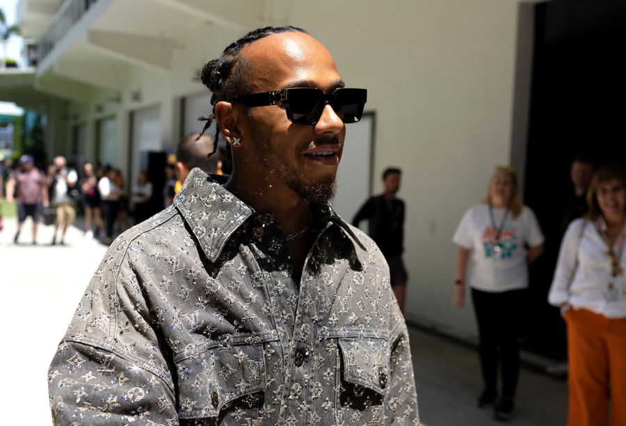 Formula One F1 – Miami Grand Prix – Miami International Autodrome, Miami, Florida, U.S. – May 5, 2023. Mercedes’ Lewis Hamilton arrives ahead of practice. REUTERS/Marco Bello