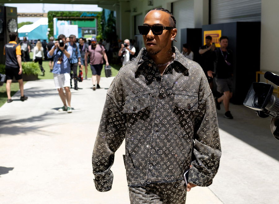 Formula One F1 – Miami Grand Prix – Miami International Autodrome, Miami, Florida, U.S. – May 5, 2023 Mercedes’ Lewis Hamilton arrives ahead of practice REUTERS/Marco Bello