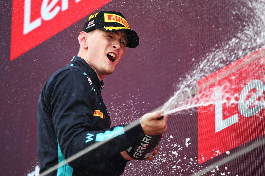 NORTHAMPTON, ENGLAND – JULY 03: Race winner Logan Sargeant of United States and Carlin (6) celebrates on the podium during the Round 7:Silverstone Feature race of the Formula 2 Championship at Silverstone on July 03, 2022 in Northampton, England. (Photo by Joe Portlock – Formula 1/Formula Motorsport Limited via Getty Images)