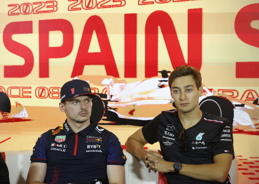 Formula One F1 – Spanish Grand Prix – Circuit de Barcelona-Catalunya, Barcelona, Spain – June 1, 2023 Red Bull’s Max Verstappen and Mercedes’ George Russell during a press conference REUTERS/Albert Gea
