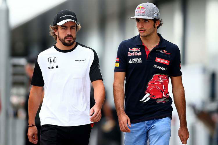 NORTHAMPTON, ENGLAND – JULY 03: Carlos Sainz of Spain and Scuderia Toro Rosso speaks with Fernando Alonso of Spain and McLaren Honda as the walk in the paddock during practice for the Formula One Grand Prix of Great Britain at Silverstone Circuit on July 3, 2015 in Northampton, England. (Photo by Mark Thompson/Getty Images) // Getty Images/Red Bull Content Pool // P-20150703-00790 // Usage for editorial use only // Please go to www.redbullcontentpool.com for further information. //