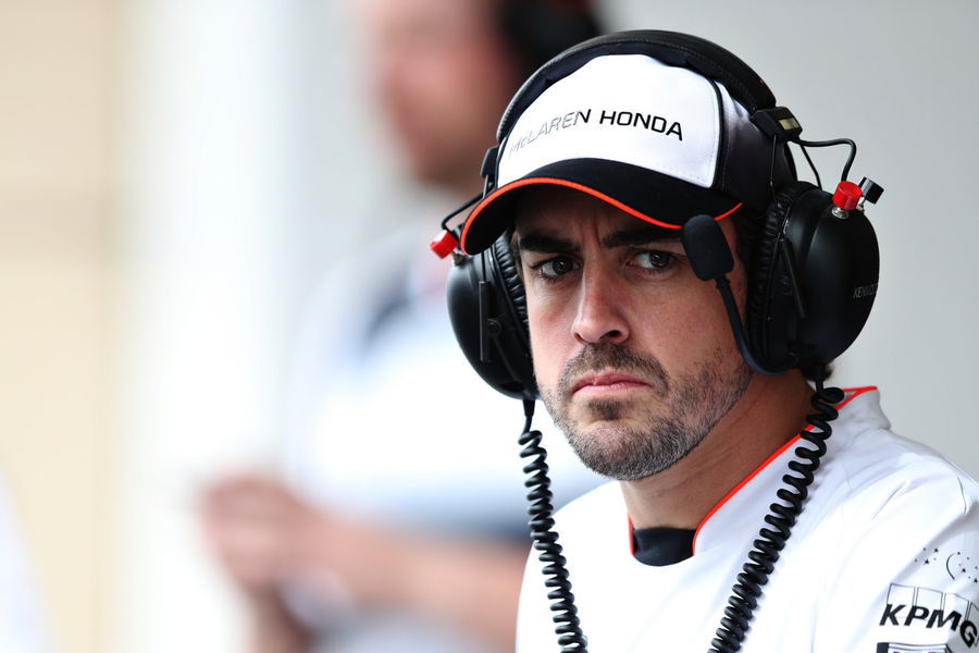 Fernando Alonso of Spain and McLaren Honda watches the action in the pitlane during practice for the Bahrain Formula One Grand Prix at Bahrain International Circuit in Sakhir, Bahrain. (Photo by Mark Thompson/Getty Images)