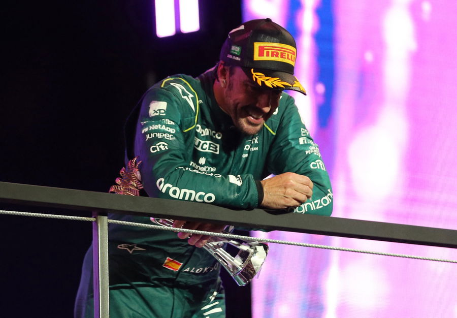 Formula One F1 – Saudi Arabian Grand Prix – Jeddah Corniche Circuit, Jeddah, Saudi Arabia – March 19, 2023 Aston Martin’s Fernando Alonso celebrates on the podium after finishing third place in the Saudi Arabian Grand Prix before he is handed a 10 second time penalty that drops him to fourth place in the final results REUTERS/Ahmed Yosri