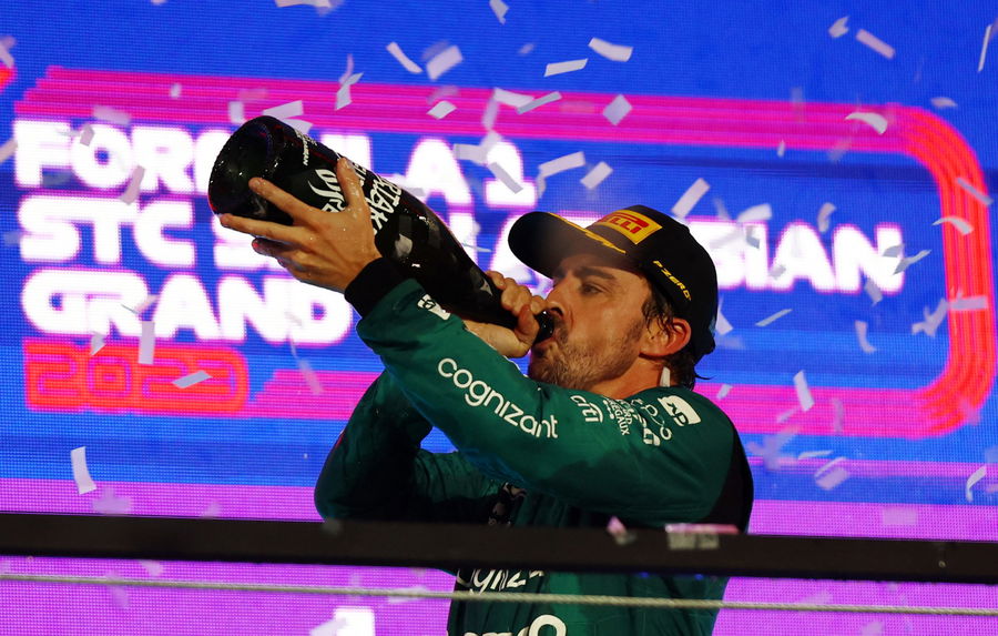 Formula One F1 – Saudi Arabian Grand Prix – Jeddah Corniche Circuit, Jeddah, Saudi Arabia – March 19, 2023 Aston Martin’s Fernando Alonso drinks champagne on the podium after finishing third place in the Saudi Arabian Grand Prix before he was handed a 10 second time penalty that drops him to fourth place in the final results REUTERS/Rula Rouhana
