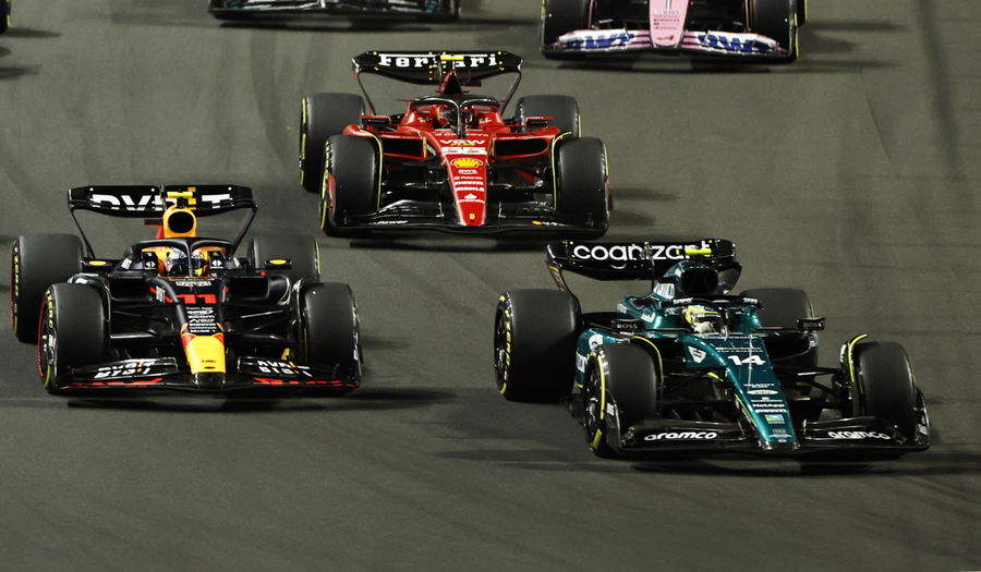 Formula One F1 – Saudi Arabian Grand Prix – Jeddah Corniche Circuit, Jeddah, Saudi Arabia – March 19, 2023. Aston Martin’s Fernando Alonso in action ahead of Red Bull’s Sergio Perez. And Ferrari’s Carlos Sainz Jr. at the start of the race. REUTERS/Hamad I Mohammed