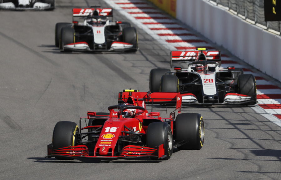 Formula One F1 – Russian Grand Prix – Sochi Autodrom, Sochi, Russia – Ferrari’s Charles Leclerc and Haas’ Kevin Magnussen in action during the race. Pool via REUTERS/Yuri Kochetkov