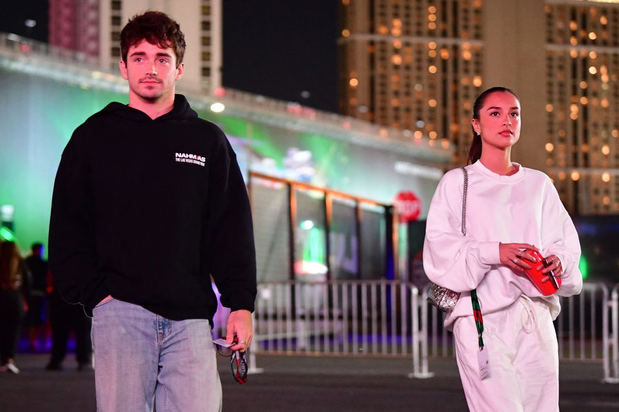 Nov 16, 2023; Las Vegas, Nevada, USA; Scuderia Ferrari driver Charles LeClerc of Monaco (16) arrives with girlfriend Alexandra Saint Mleux before free practice at Las Vegas Strip Circuit. Mandatory Credit: Gary A. Vasquez-USA TODAY Sports