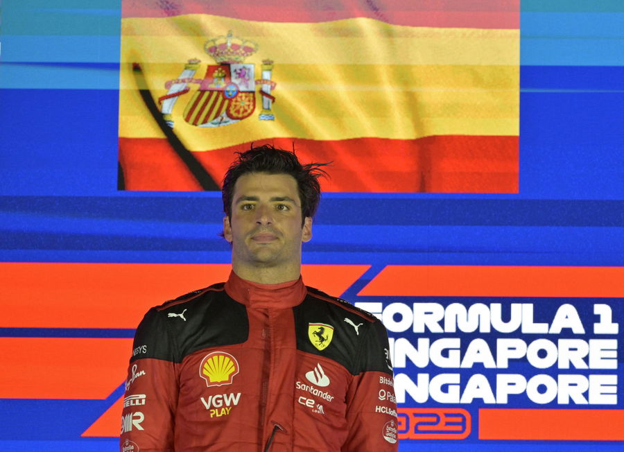 Formula One F1 – Singapore Grand Prix – Marina Bay Street Circuit, Singapore – September 17, 2023 Ferrari’s Carlos Sainz Jr. celebrates on the podium after winning the Singapore Grand Prix REUTERS/Caroline Chia/Pool