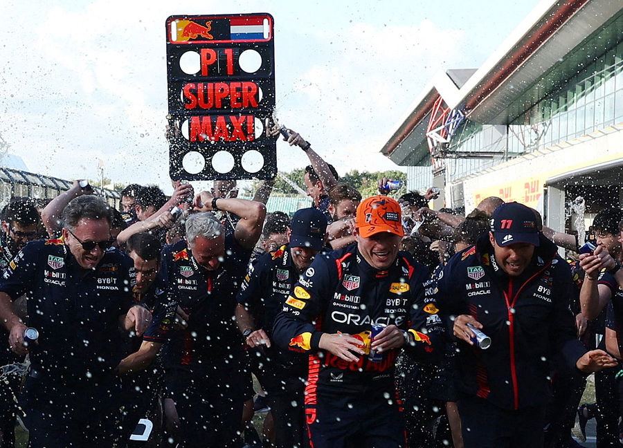 Formula One F1 – British Grand Prix – Silverstone Circuit, Silverstone, Britain – July 9, 2023. Red Bull’s Max Verstappen celebrates with his team after winning the race. REUTERS/Andrew Boyers