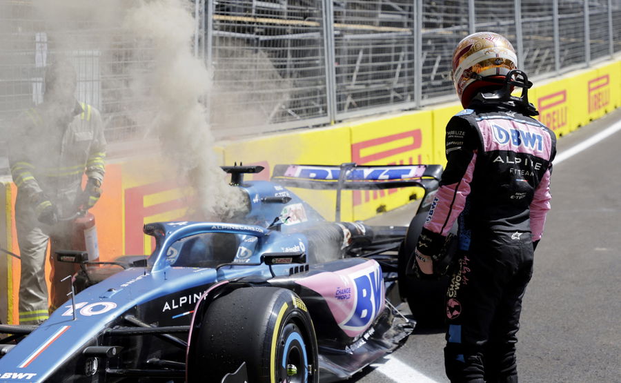 Formula One F1 – Azerbaijan Grand Prix – Baku City Circuit, Baku, Azerbaijan – April 28, 2023 Marshals extinguish a fire on the car of Alpine’s Pierre Gasly during practice REUTERS/Leonhard Foeger