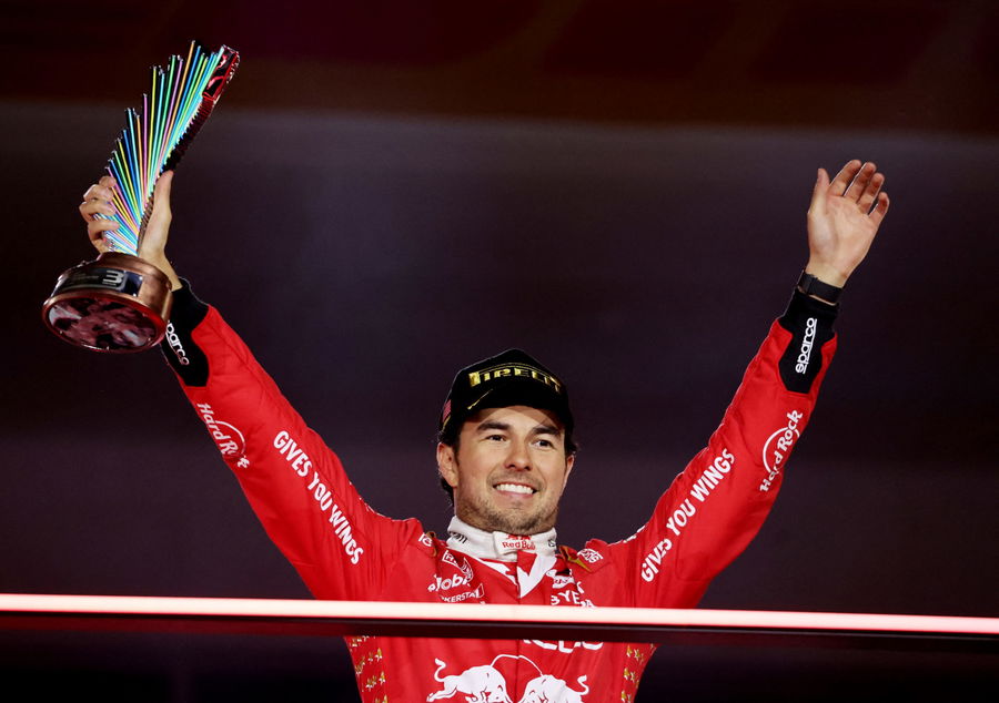 Formula One F1 – Las Vegas Grand Prix – Las Vegas Strip Circuit, Las Vegas, Nevada, U.S – November 18, 2023 Third place Red Bull’s Sergio Perez celebrates with his trophy on the podium REUTERS/Mike Blake