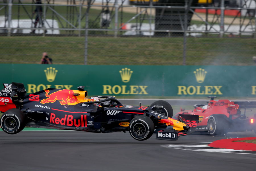 NORTHAMPTON, ENGLAND – JULY 14: Max Verstappen of the Netherlands driving the (33) Aston Martin Red Bull Racing RB15 and Sebastian Vettel of Germany driving the (5) Scuderia Ferrari SF90 crash during the F1 Grand Prix of Great Britain at Silverstone on July 14, 2019 in Northampton, England. (Photo by Charles Coates/Getty Images)