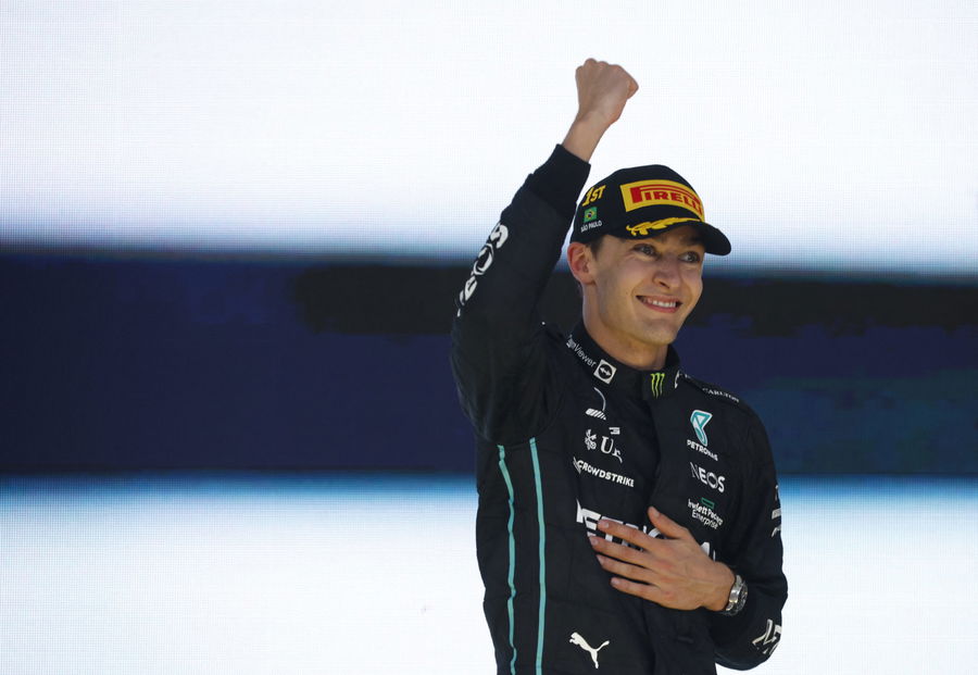 Formula One F1 – Brazilian Grand Prix – Jose Carlos Pace Circuit, Sao Paulo, Brazil – November 13, 2022 Mercedes’ George Russell celebrates on the podium after winning the race REUTERS/Amanda Perobelli
