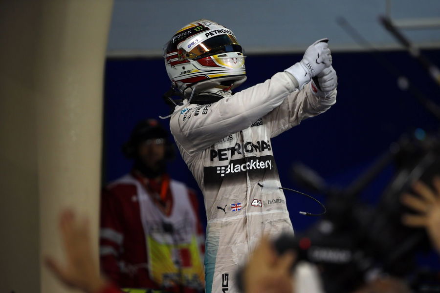 Bahrain International Circuit Sakhir Bahrain Sunday 19 April 2015 Lewis Hamilton Mercedes AMG 1st Position Celebrates with A Golf Swing in Parc Ferme World PUBLICATIONxINxGERxSUIxAUTxHUNxONLY