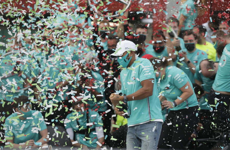 Formula One F1 – Emilia Romagna Grand Prix – Autodromo Enzo e Dino Ferrari, Imola, Italy – Race winner Lewis Hamilton as the Mercedes team celebrates winning the constructor’s championship Pool via Reuters/Luca Bruno