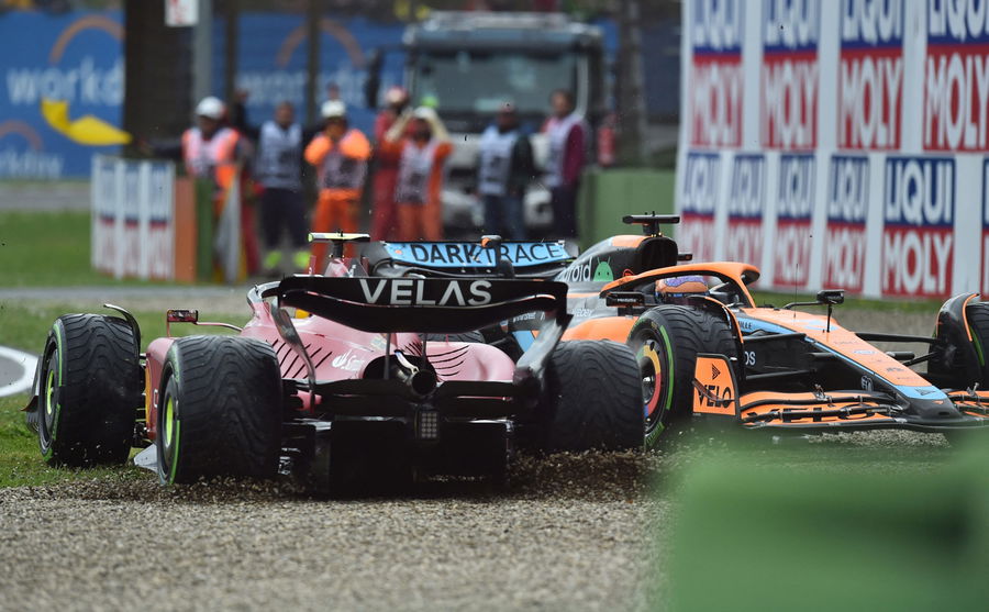 Formula One F1 – Emilia Romagna Grand Prix – Autodromo Enzo e Dino Ferrari, Imola, Italy – April 24, 2022, Ferrari’s Carlos Sainz Jr. and McLaren’s Daniel Ricciardo after they crashed out of the race REUTERS/Massimo Pinca