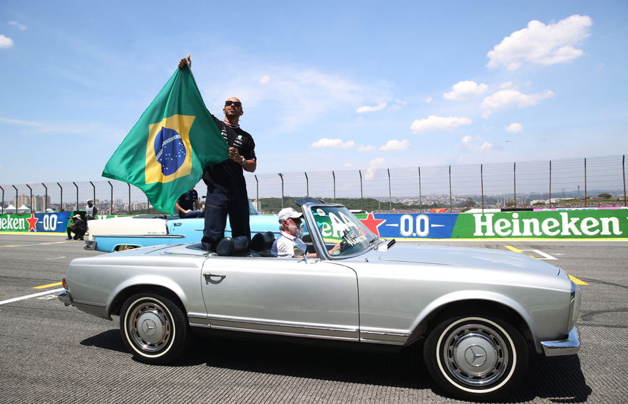 Formula One F1 – Brazilian Grand Prix – Jose Carlos Pace Circuit, Sao Paulo, Brazil – November 13, 2022 Mercedes’ Lewis Hamilton with a Brazil flag during the drivers parade ahead of the race REUTERS/Amanda Perobelli