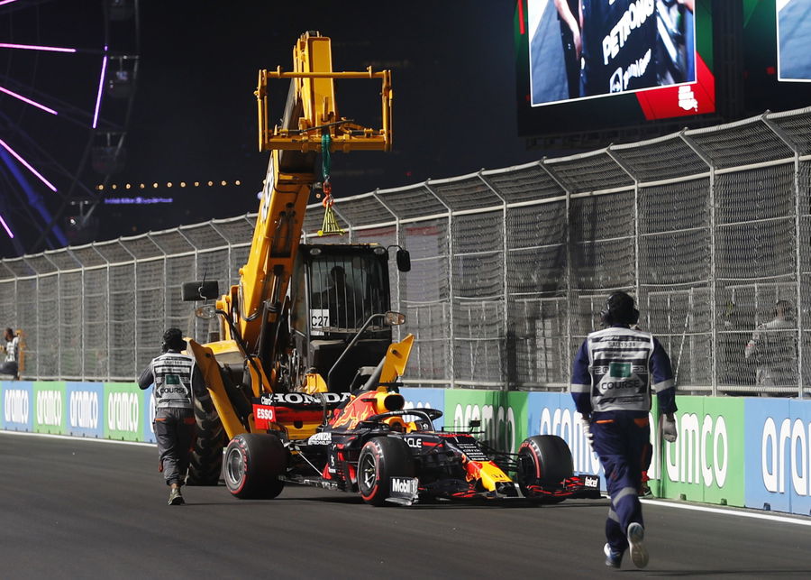 Formula One F1- Saudi Arabian Grand Prix – Jeddah Corniche Circuit, Jeddah, Saudi Arabia – December 4, 2021 Stewards remove the car of Red Bull’s Max Verstappen following a crash during qualifying REUTERS/Hamad I Mohammed