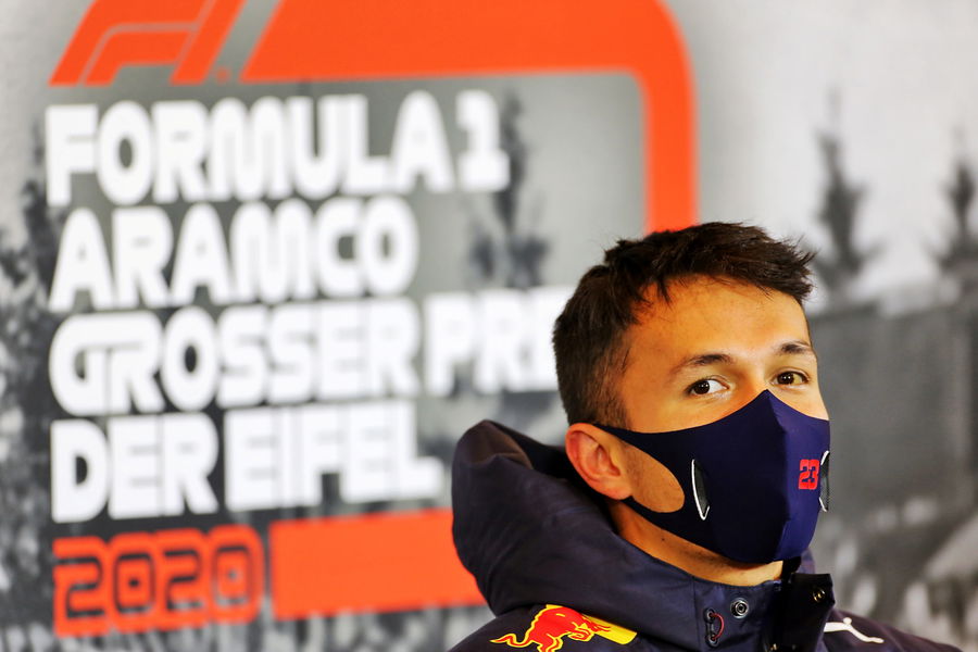 Formula One F1 – Eifel Grand Prix – Nurburgring, Nurburg, Germany – Red Bull’s Alexander Albon wearing a protective face mask during a press conference ahead of the Eifel Grand Prix FIA/Handout via REUTERS