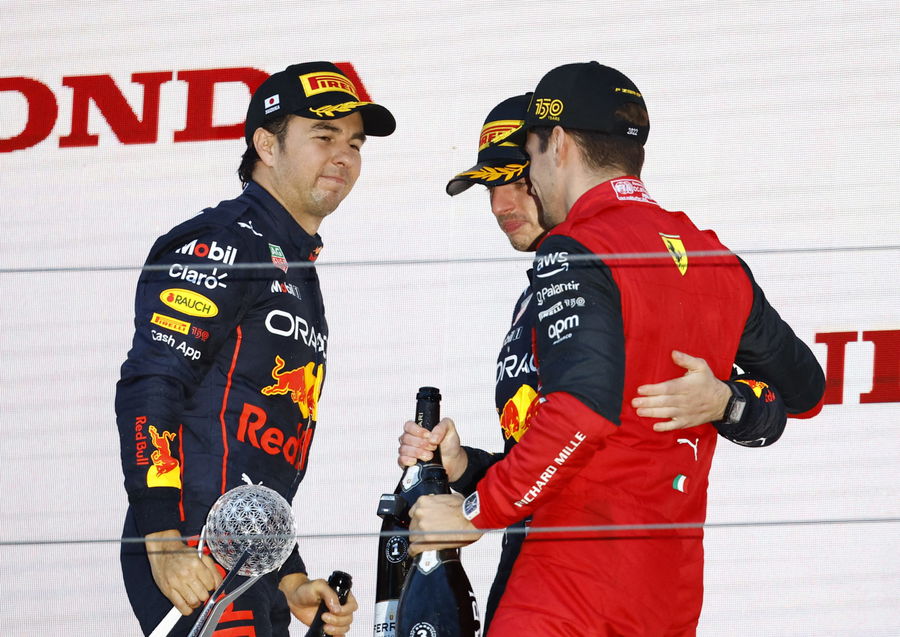 Formula One F1 – Japanese Grand Prix – Suzuka Circuit, Suzuka, Japan – October 9, 2022 Red Bull’s Max Verstappen celebrates winning the race and the championship on the podium with second placed Red Bull’s Sergio Perez and third placed Ferrari’s Charles Leclerc REUTERS/Kim Kyung-Hoon=