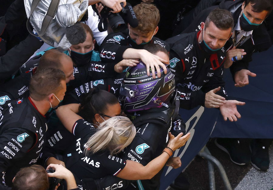 Formula One F1 – Russian Grand Prix – Sochi Autodrom, Sochi, Russia – September 26, 2021 Mercedes’ Lewis Hamilton celebrates with teammates after winning the race REUTERS/Maxim Shemetov