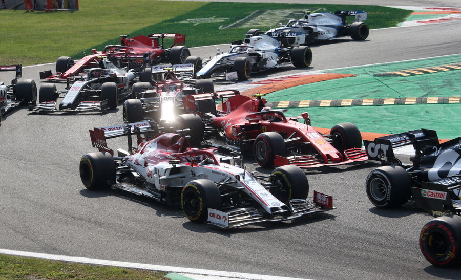 Formula One F1 – Italian Grand Prix – Autodromo Nazionale Monza, Monza, Italy – September 6, 2020 Alfa Romeo’s Kimi Raikkonen and Ferrari’s Charles Leclerc with drivers during the race Pool | Courtesy: Reuters