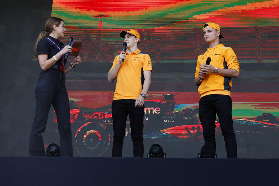 Formula 1 2023: Bahrain GP BAHRAIN INTERNATIONAL CIRCUIT, BAHRAIN – MARCH 03: Oscar Piastri, McLaren, and Lando Norris, McLaren, are interviewed on stage during the Bahrain GP at Bahrain International Circuit on Friday March 03, 2023 in Sakhir, Bahrain. Photo by Steven Tee / LAT Images Images PUBLICATIONxINxGERxSUIxAUTxHUNxONLY GP2301_090034_67A4128
