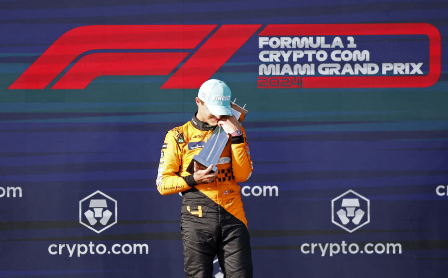 Formula One F1 – Miami Grand Prix – Miami International Autodrome, Miami, Florida, United States – May 5, 2024 McLaren’s Lando Norris celebrates winning the Miami Grand Prix on the podium with the trophy REUTERS/Marco Bello