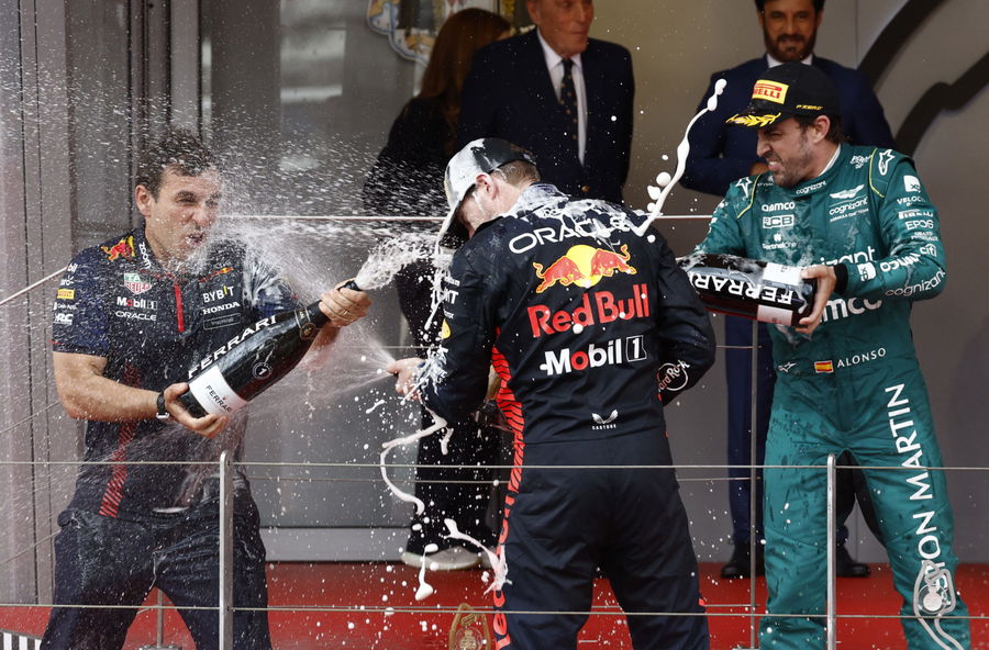Formula One F1 – Monaco Grand Prix – Circuit de Monaco, Monte Carlo, Monaco – May 28, 2023 Red Bull’s Max Verstappen celebrates with champagne on the podium after winning the Monaco Grand Prix with second placed Aston Martin’s Fernando Alonso REUTERS/Piroschka Van De Wouw
