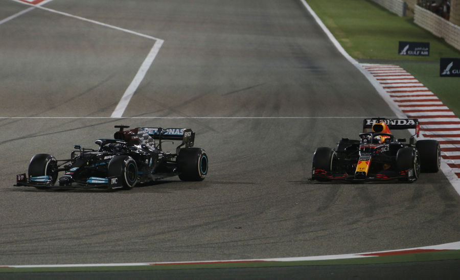 Formula One F1 – Bahrain Grand Prix – Bahrain International Circuit, Sakhir, Bahrain – Mercedes’ Lewis Hamilton and Red Bull’s Max Verstappen in action during the race REUTERS/Hamad I Mohammed