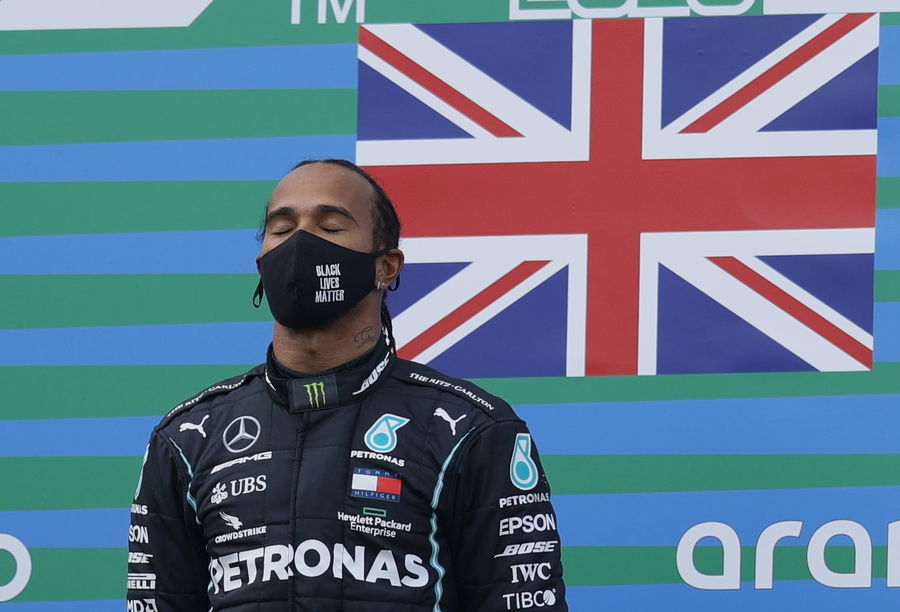 Formula One F1 – Eifel Grand Prix – Nurburgring, Nurburg, Germany – Mercedes’ Lewis Hamilton celebrates on the podium after winning the race Pool via REUTERS/Ronald Wittek